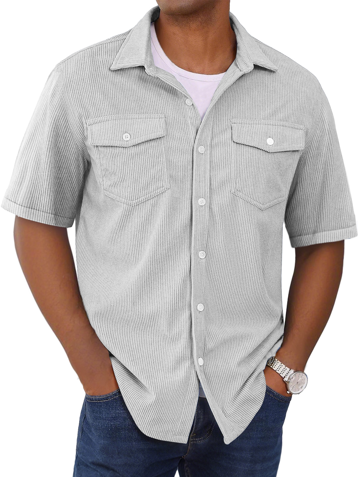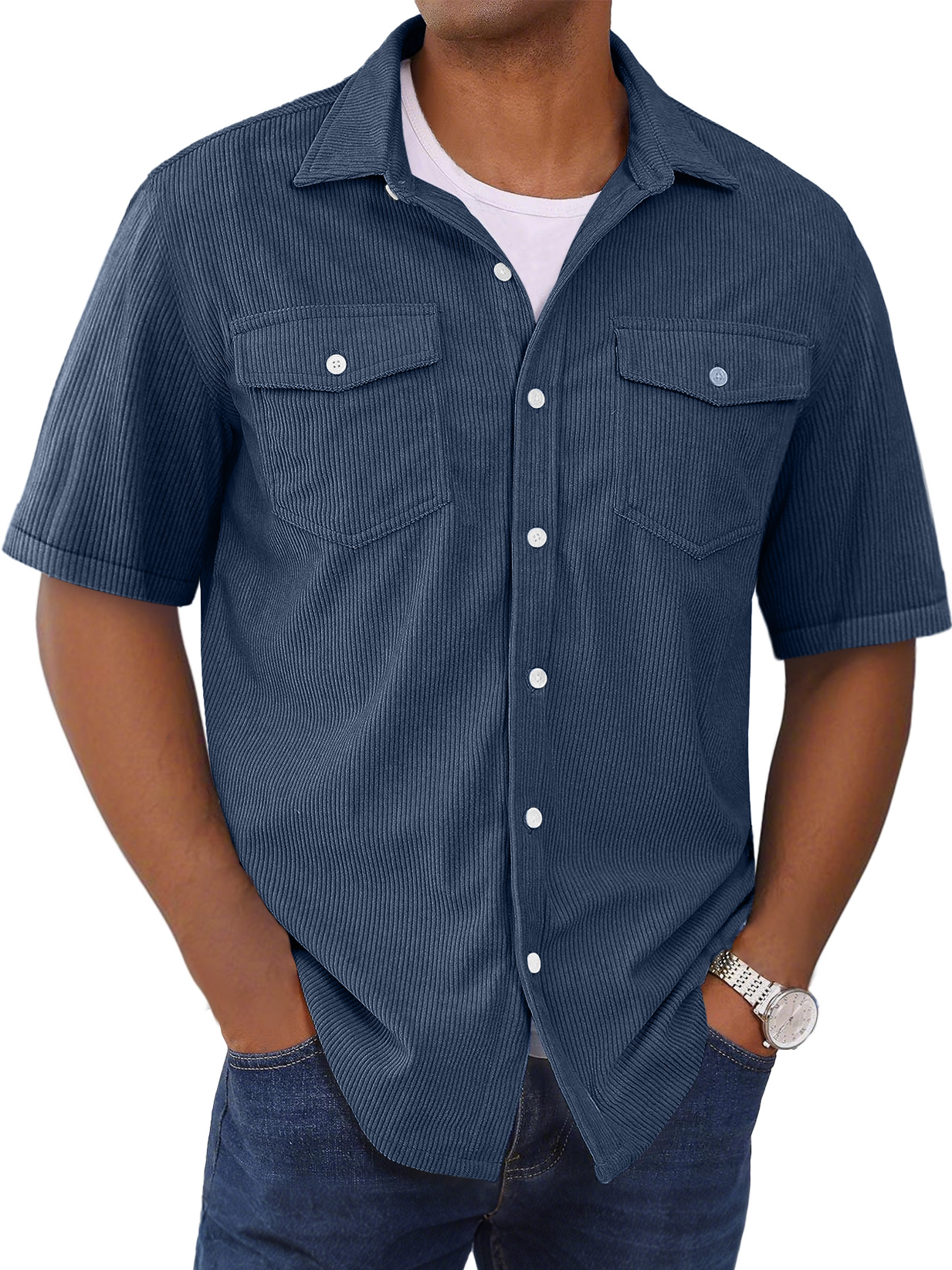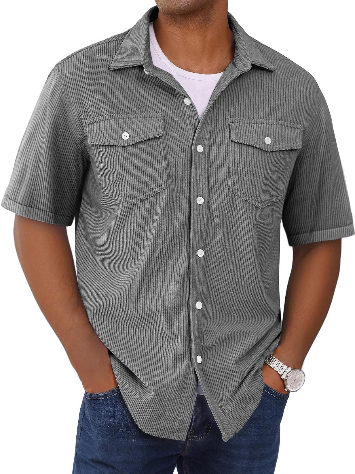 Herrenmode Kurzarmhemd mit doppelten Taschen und gestreiftem Design