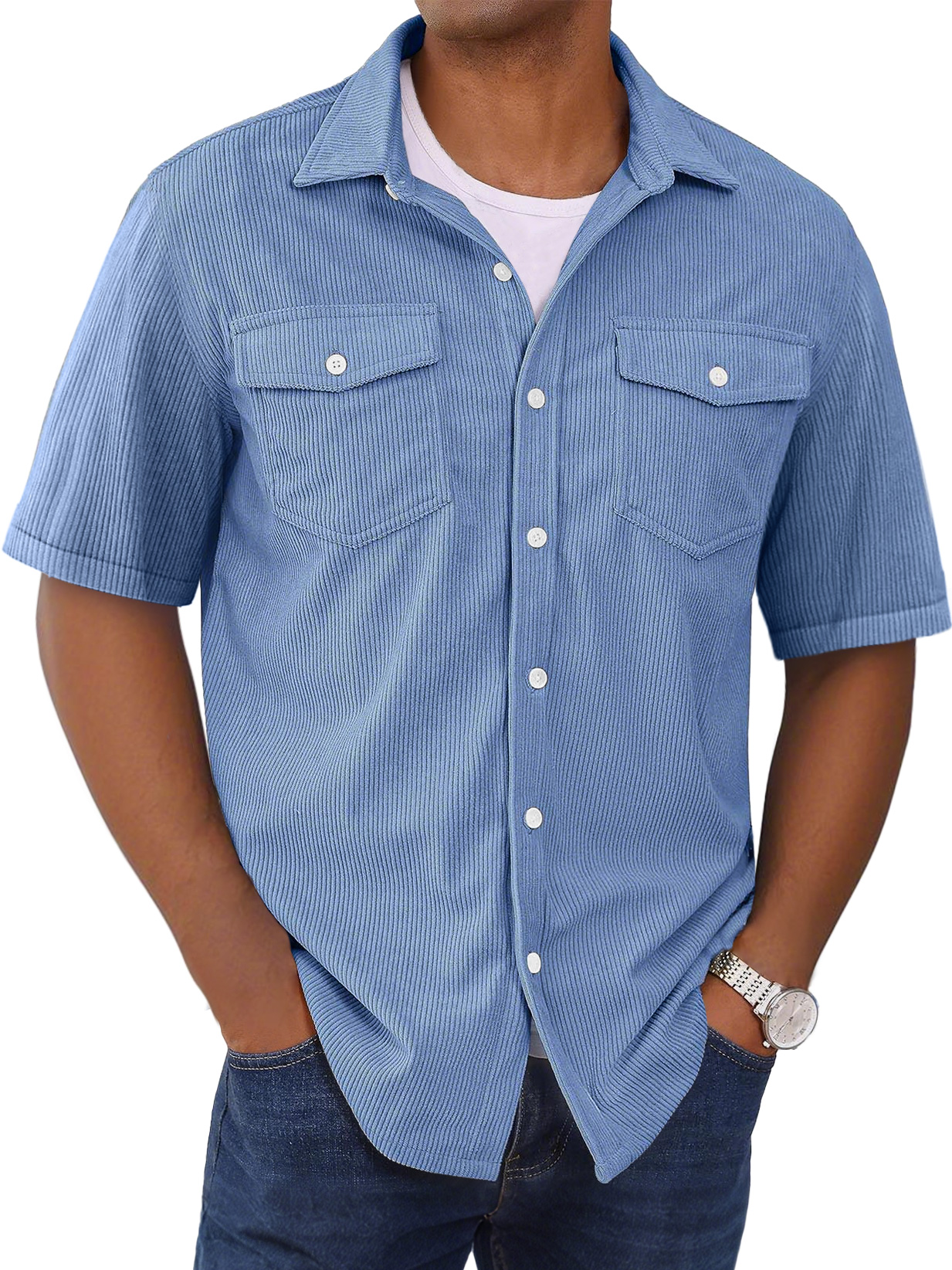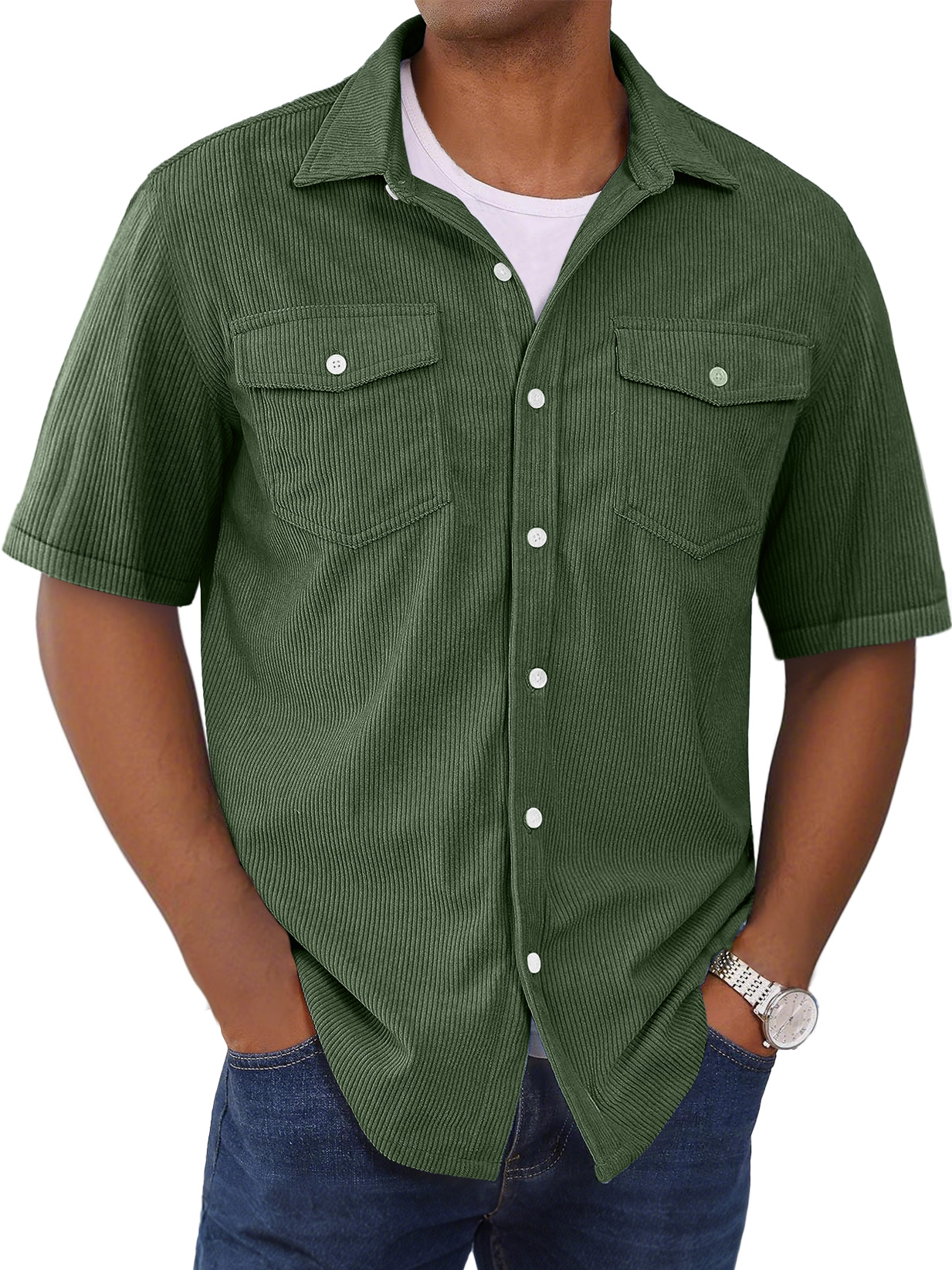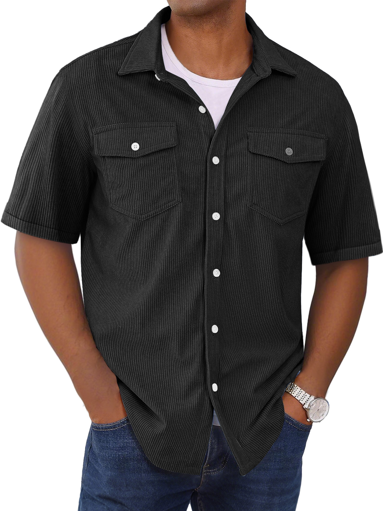 Herrenmode Kurzarmhemd mit doppelten Taschen und gestreiftem Design