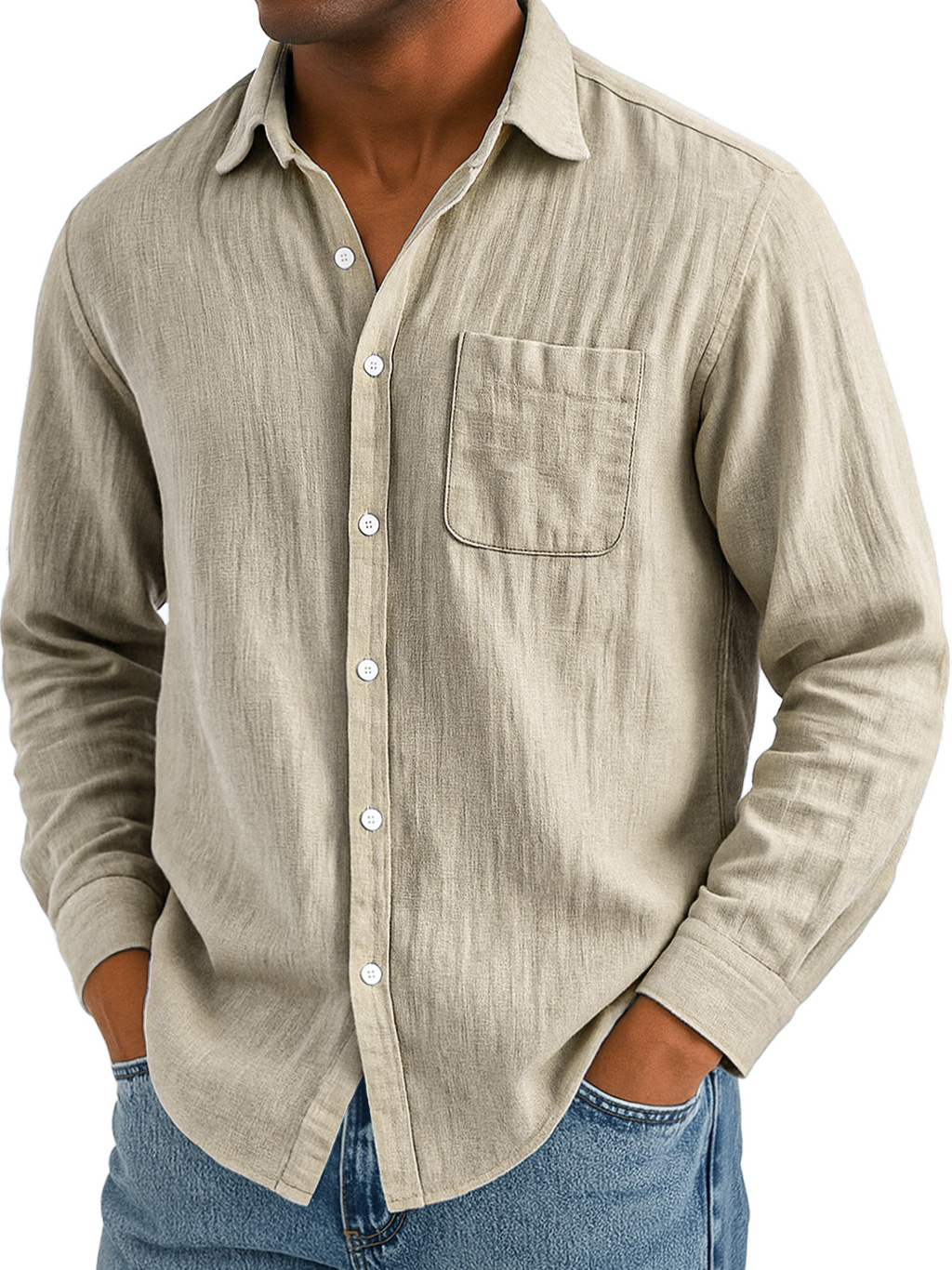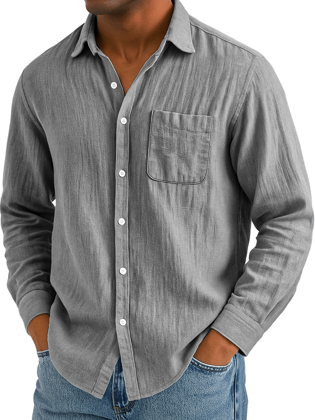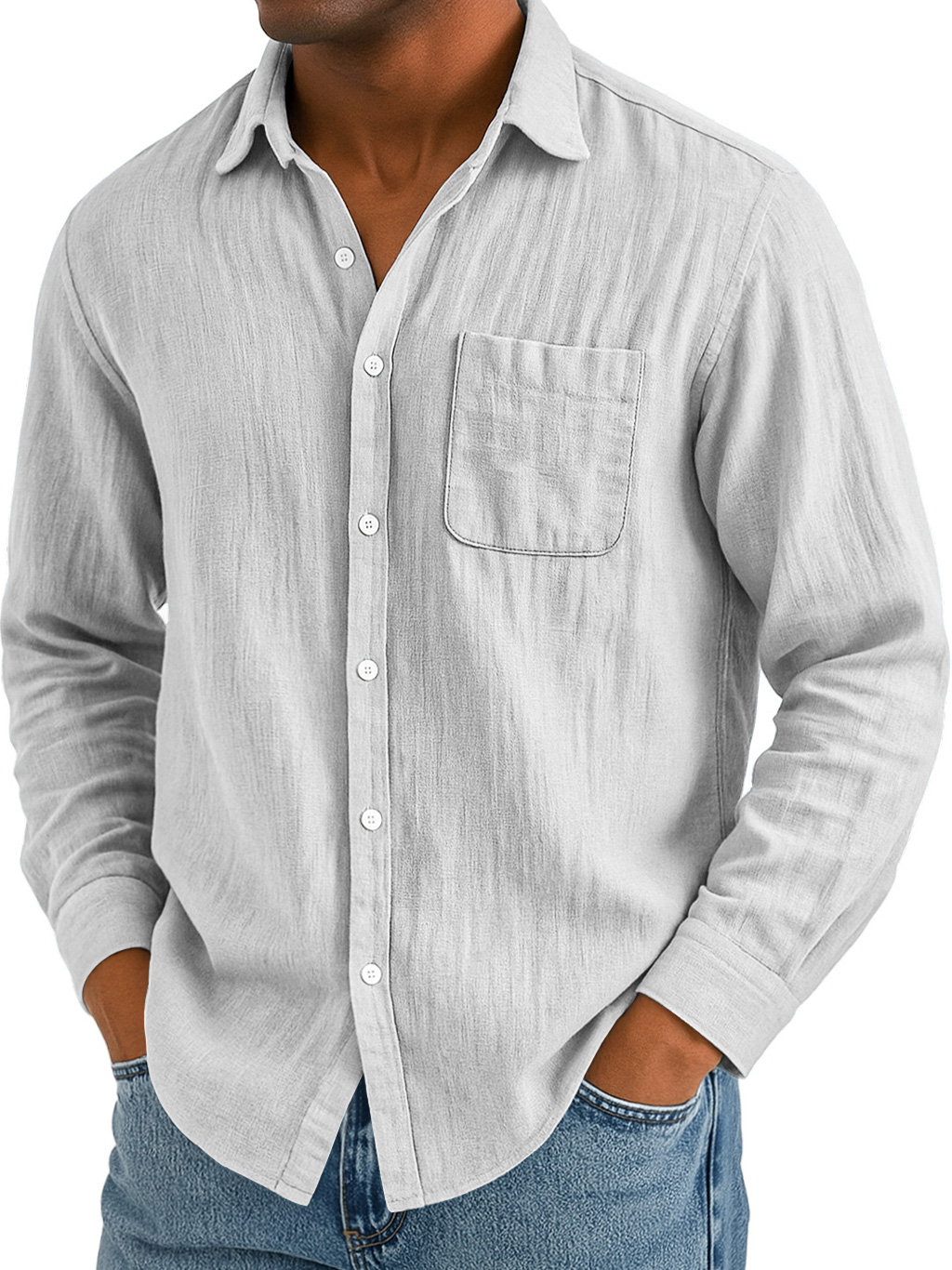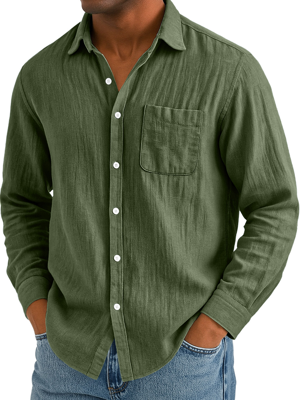 Camicia a maniche lunghe casual in cotone e lino con tasche per uomo, comoda.
