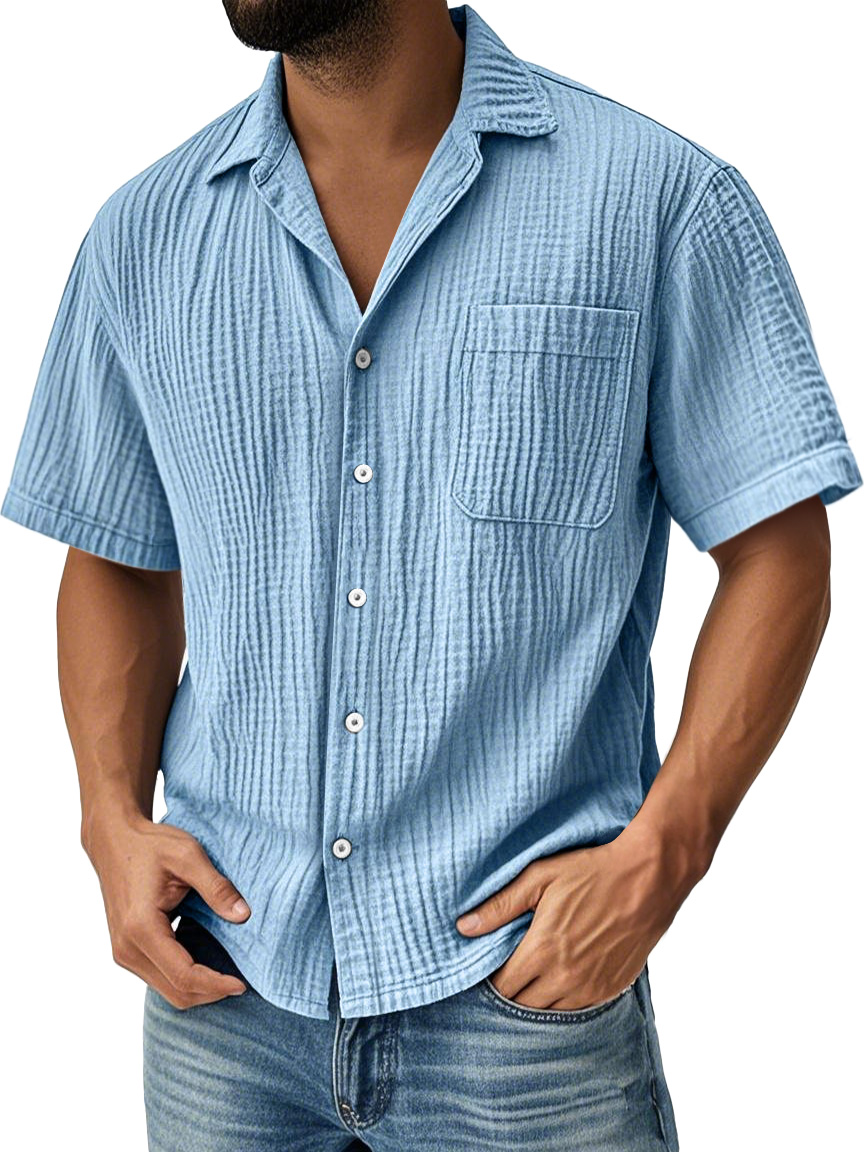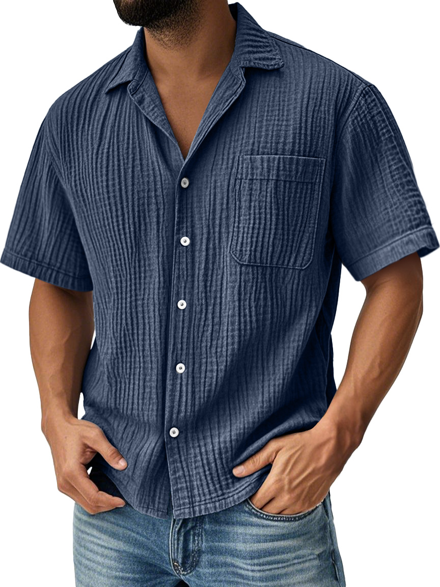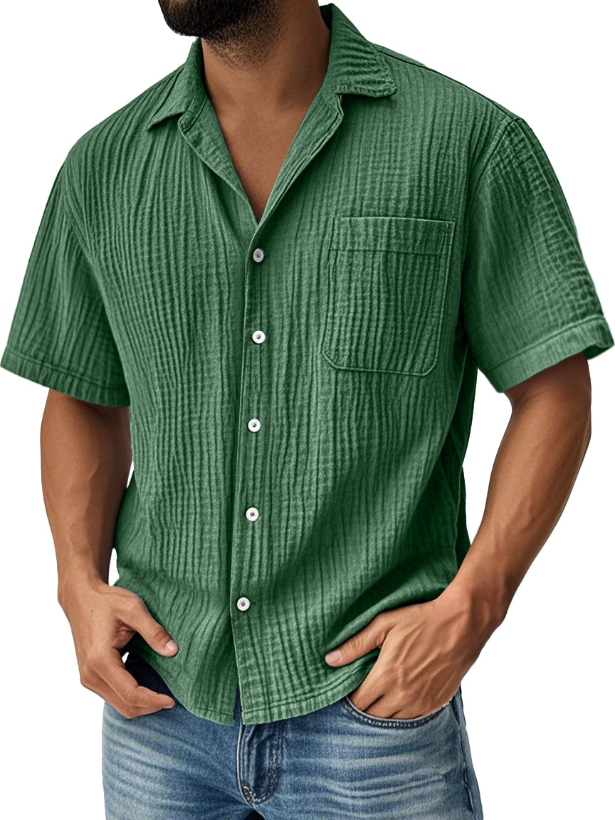 Camicia casual a maniche corte in tinta unita con tasche plissettate per uomo