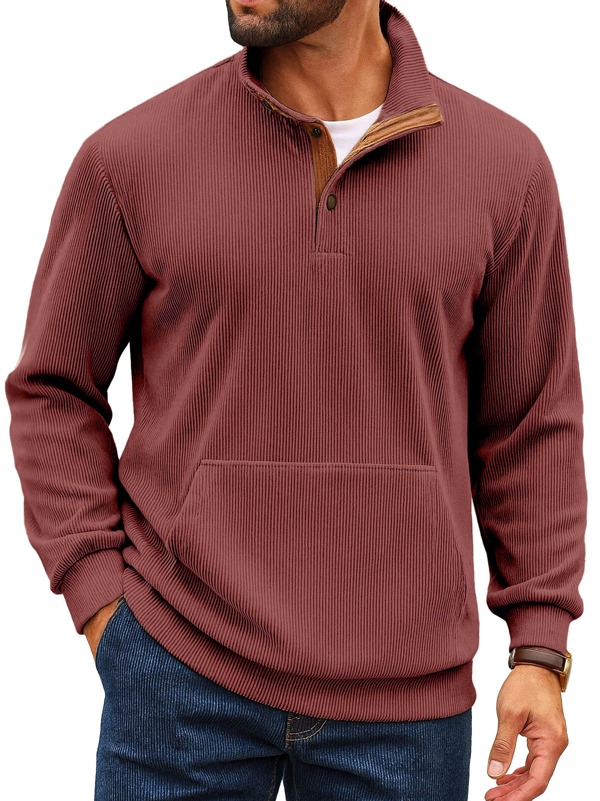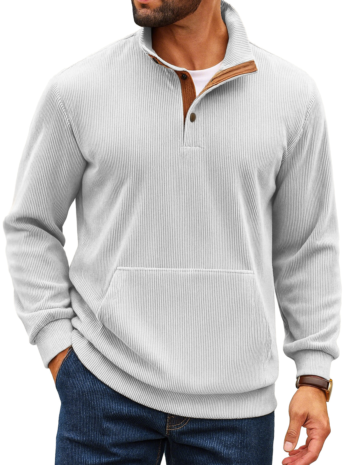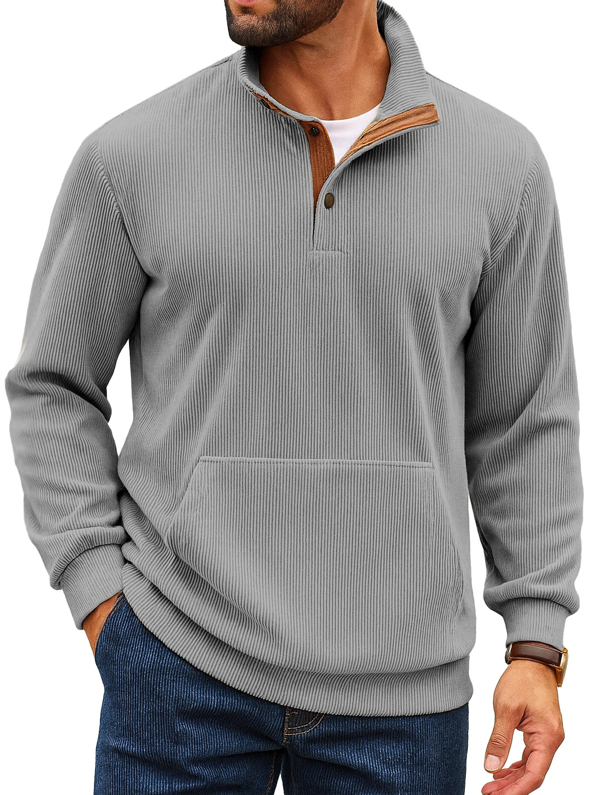 Felpa da uomo retro a tinta unita con colletto alto, striscia verticale, bottoni e maniche lunghe