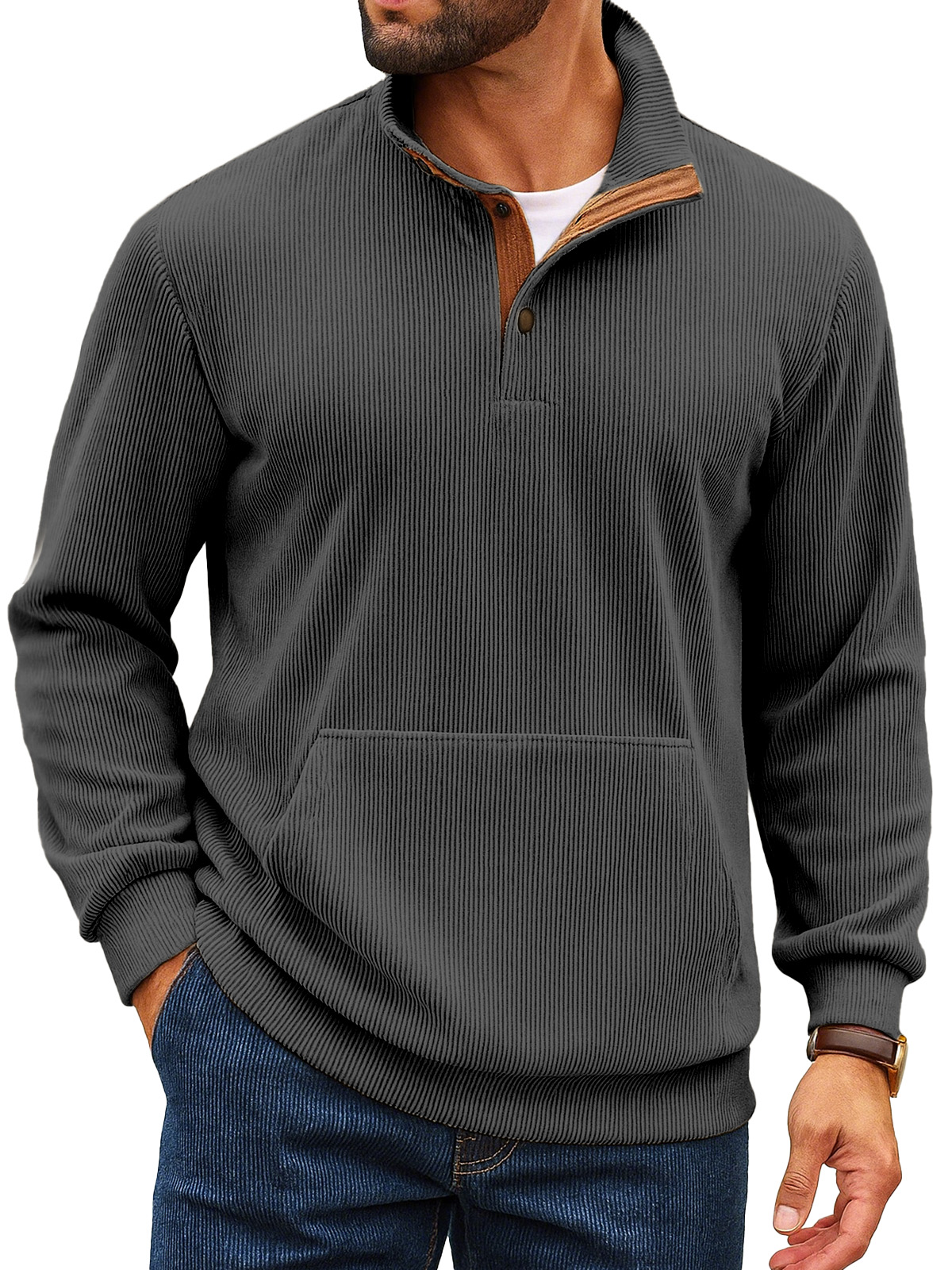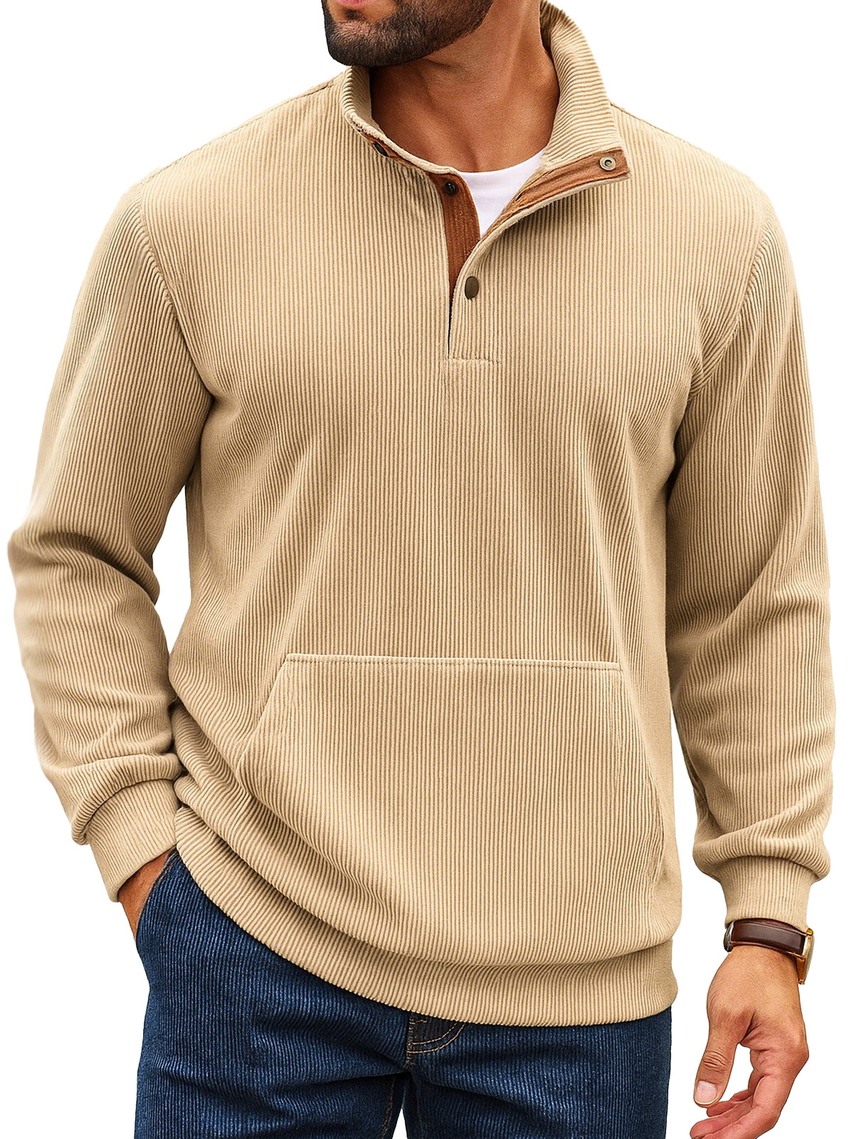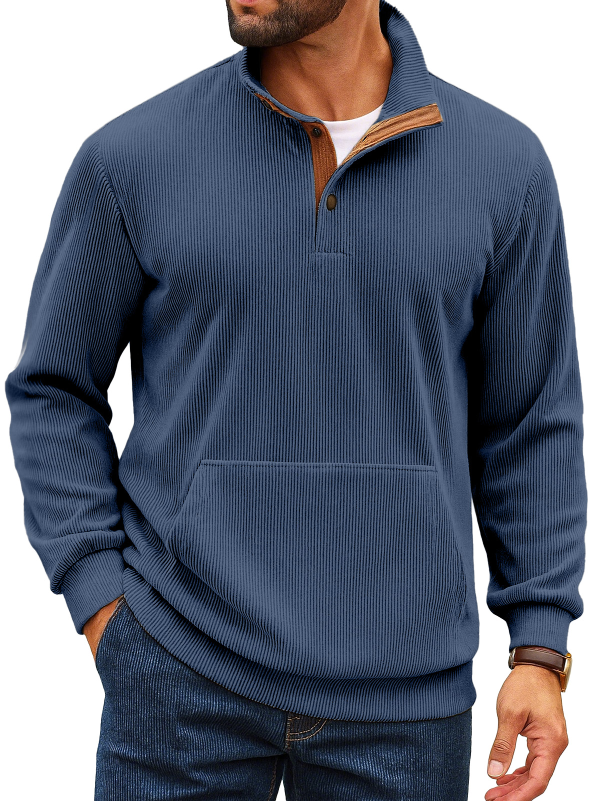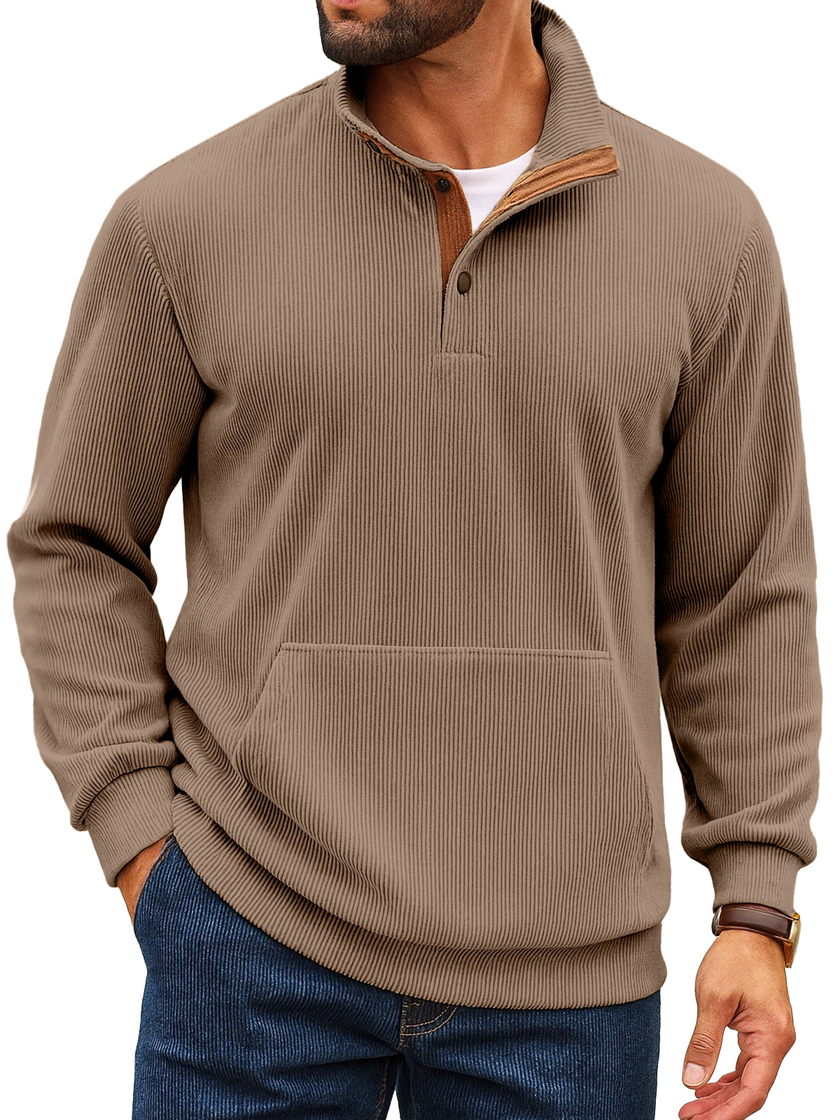 Felpa da uomo retro a tinta unita con colletto alto, striscia verticale, bottoni e maniche lunghe