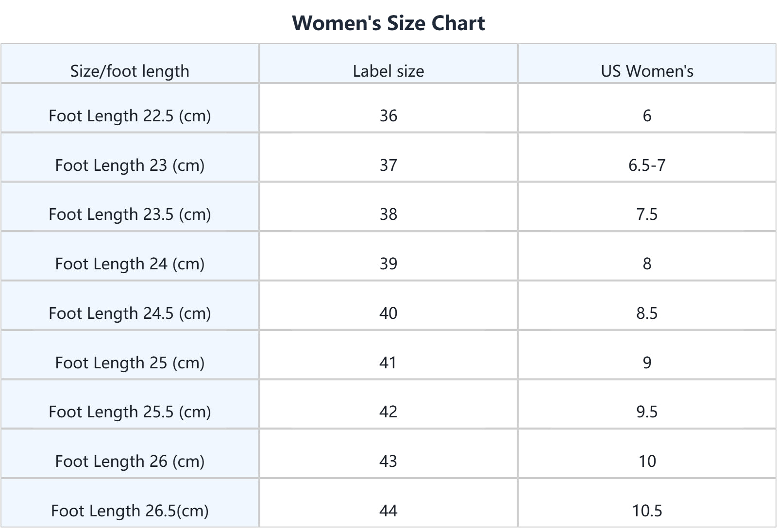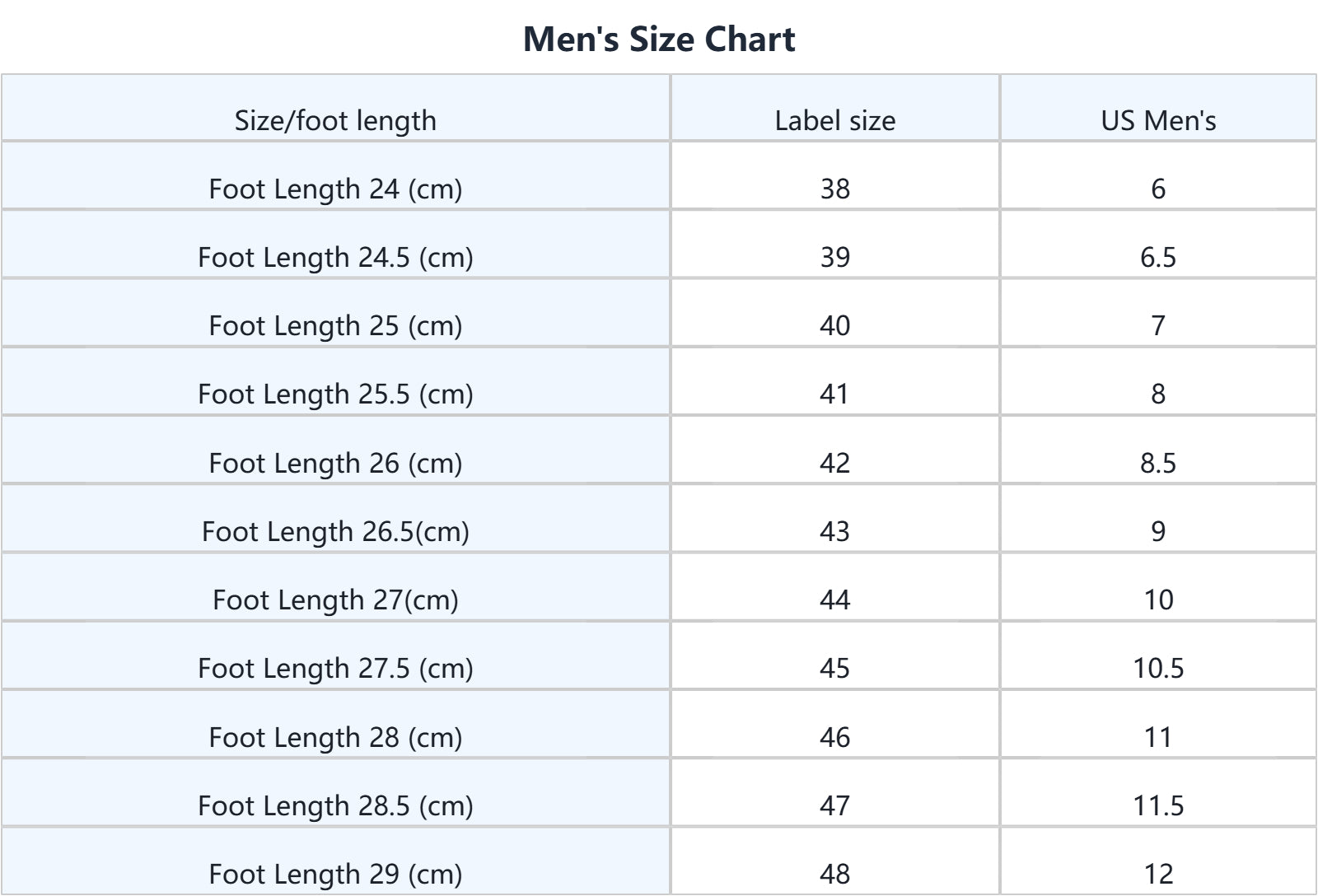 2. Once you know your foot length, consult the Size Chart to determine which size you should purchase. Some tags' UK/US size number may be different from our size chart's UK/US size number, please take our size chart as the standard reference.