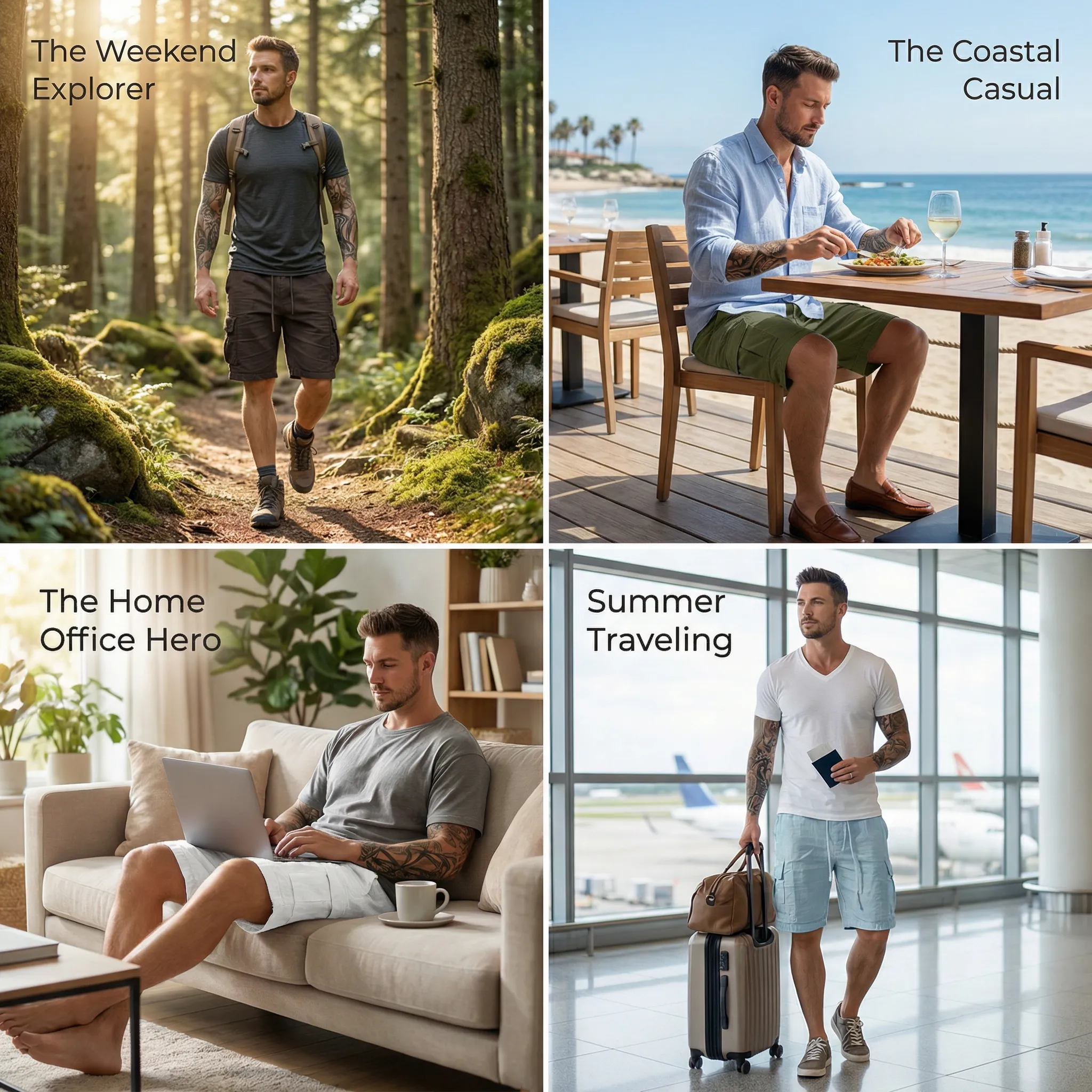 • Stiff & Sweaty: Most cargo shorts are made of heavy, non-breathable canvas that clings to your skin in the heat.
